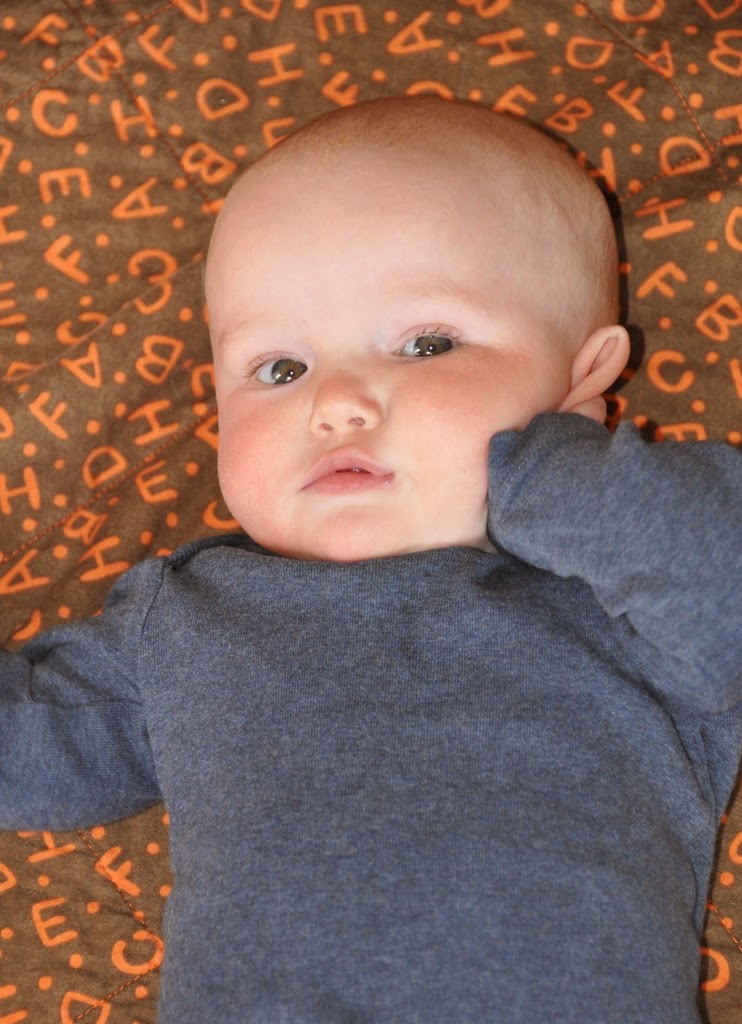 At five months, Caden is quick to smile and giggle. He is easy going and fusses very little, as long as he's eating every three hours. He naps well some days and not so much other days. He can become a little monster at night when he wakes every 2-3 hours with nursing being the only thing that soothes him. We are currently working on breaking that habit which means the last few nights, I have been up with a screaming baby a couple of times for about 30 minutes each time. We tried letting him cry it out on his own, but he outlasts us. He doesn't seem to have a shut-off time like his older brother did. He is becoming more and more interested in the world around him. He can hold objects and get them to his mouth with no problem. He likes to suck on his fists but prefers the binky. He loves the binky when he gets tired. He also loves sucking on his toes and raising his legs in the air. Sometimes, he plays by raising his legs and then slamming them back down to the floor or by slapping his own belly with his hands. He is constantly running his nails over any and all surfaces to hear the sound it makes or to feel different textures (my chest has permanent claw marks). He especially likes scratchy-sounding surfaces, like the canvas on the stroller or the material of the big chair. He loves his big brother more than anything else. He sees Isaac and immediately smiles. If Isaac is in the room, Cade's gaze is fixed on him. This can be problematic when trying to nurse. He enjoys being outside which we are doing a lot more now that the weather has warmed up. He likes scrunching up his little bare toes in sand and grass. He is social and doesn't mind being handed off to new people. He hasn't had any food yet but will try rice cereal soon. He can sit up a bit with lots of support. He loves baring weight on his legs to stand, with help of course. He is a beautiful, bright-eyed, chubby little boy and brings us much joy.